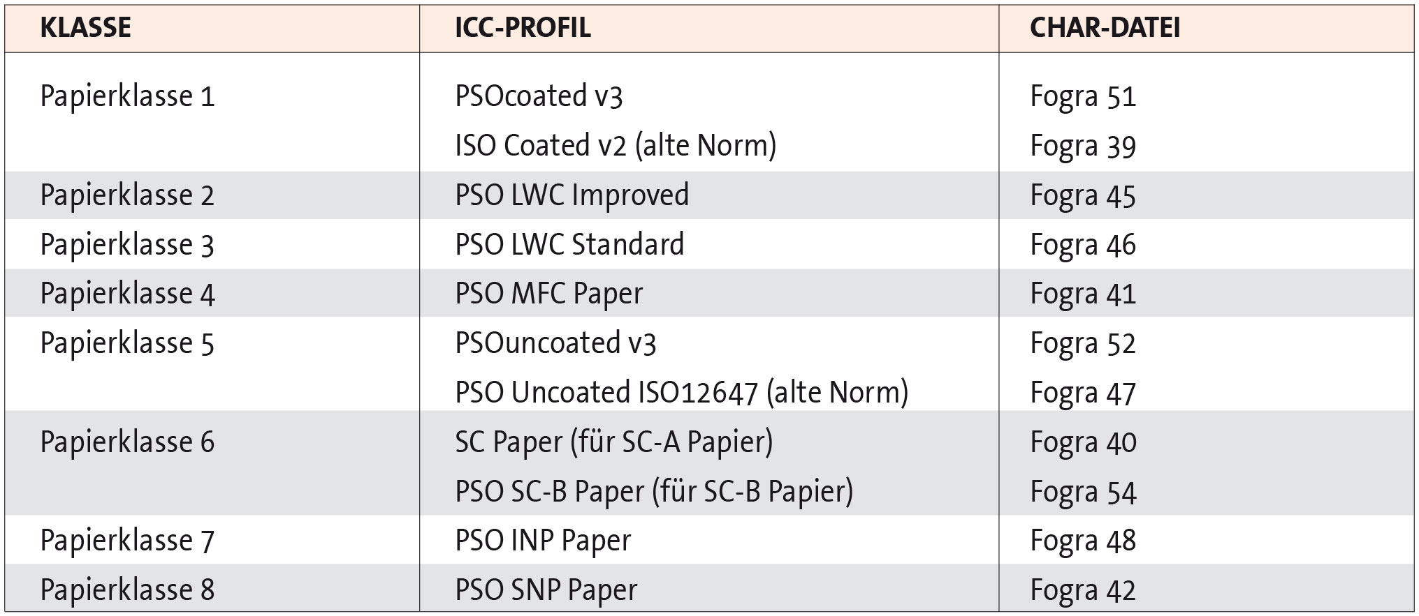 Die Klassifizierung entspricht dem Standard der jeweils gültigen DIN-ISO 12647-2. Die ICC-Profile können hier heruntergeladen werden: http://www.eci.org